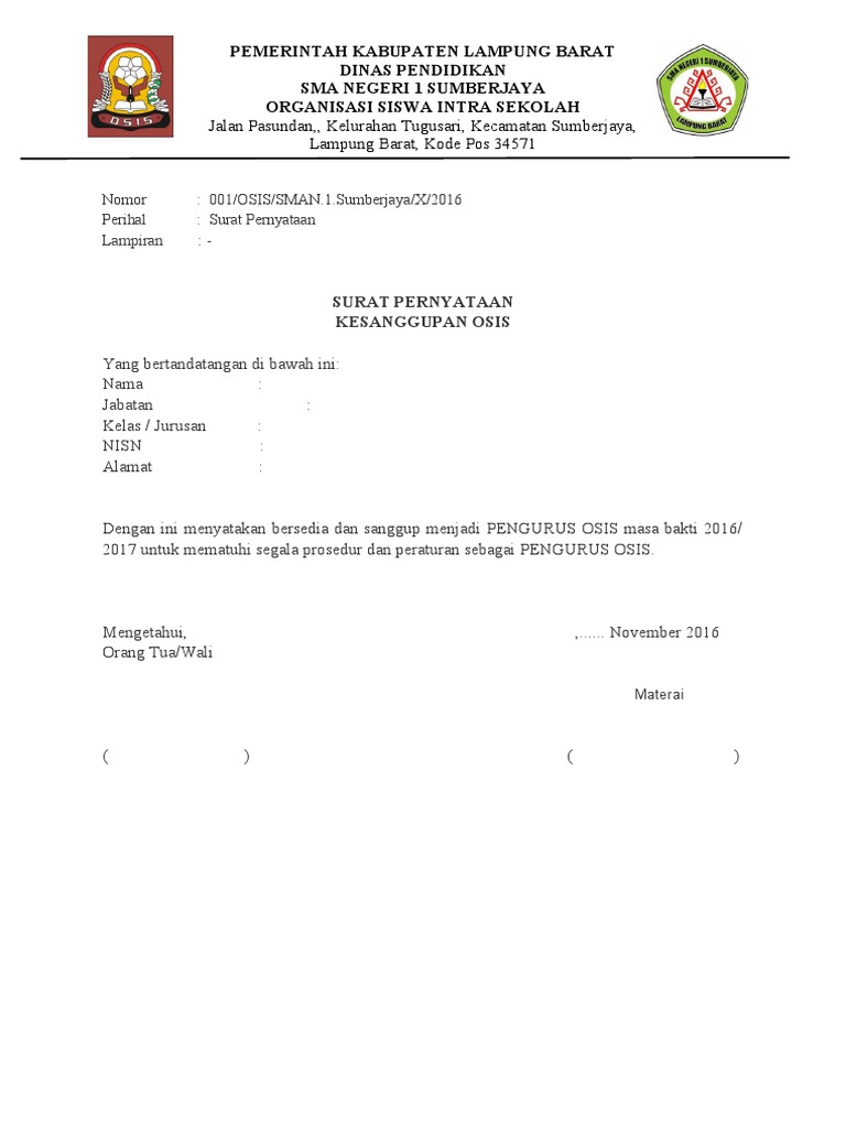 Contoh Surat Pernyataan Kesanggupan Menjadi Pengurus Osis / Contoh Dokumen Pilkades / Tidak menjadi anggota dan atau pengurus partai politik. Ada banyak contoh surat pernyataan yang biasanya banyak digunakan, mulai dari surat pernyataan belum menikah, surat pernyataan diri. Yang bertandatangan di bawah ini Demikianlah artikel mengenai beberapa contoh surat pernyataan kesanggupan yang baik. Contoh surat pernyataan kesanggupan karyawan untuk ditempatkan di mana saja. Surat pernyataan kesanggupan harus mencatumkan sebuah pernyataan secara jelas akan kesanggupan untuk melakasanakan tugas yang akan diberikan serta mau menanggung resiko apapun baik berupa hukuman atau hal lainnya jika terbukti bersalah atau gagal dalam menjalankan tugas.